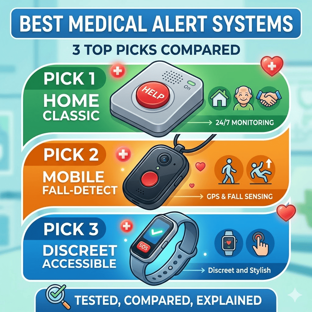 The 3 top-recommended medical alert systems cover 3 completely different use cases, price points, and user needs, with a 3-year cost gap of $2,342 between the least and most expensive option.