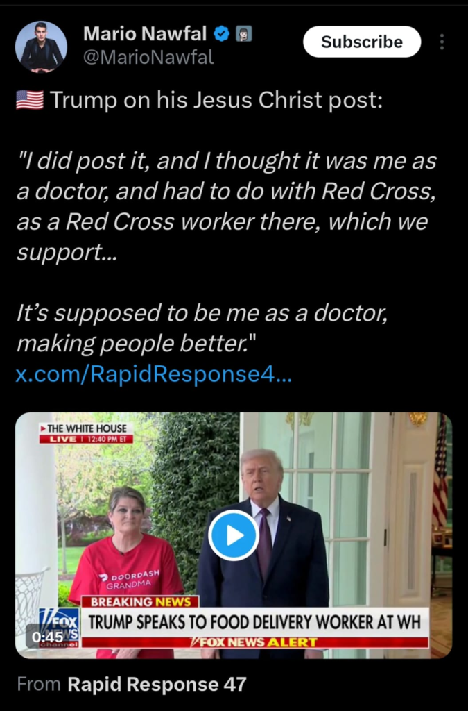 The contradictory position is the one that Trump’s explanation attempts to occupy. If the image was genuinely misunderstood by its poster as depicting a doctor rather than a messianic figure, the misunderstanding required not recognizing one of the most visually distinctive iconographic formats in Western cultural history. A figure in white robes with glowing hands performing miraculous healing, surrounded by ethereal light, on the day Christians celebrate the resurrection.